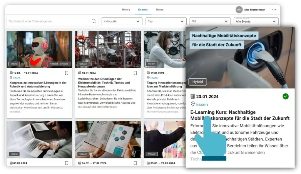 Hier werden neben klassichen Events Seminare, Webinare, Kurse und Onboardings angeboten. Die Angebote sind dabei individualisiert. Ihr seht als i.d.R. das, was für euch persönlich relevant ist.